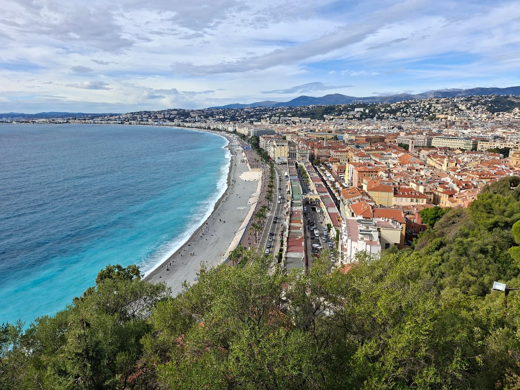 Craving exercise, I hike up to the Colline du Château. The steep staircases climbing the hill are a solid workout in the afternoon sun, but the views are worth it. I can see the entire length of the promenade stretching towards the airport in one direction, the food market, and the old town in the other.