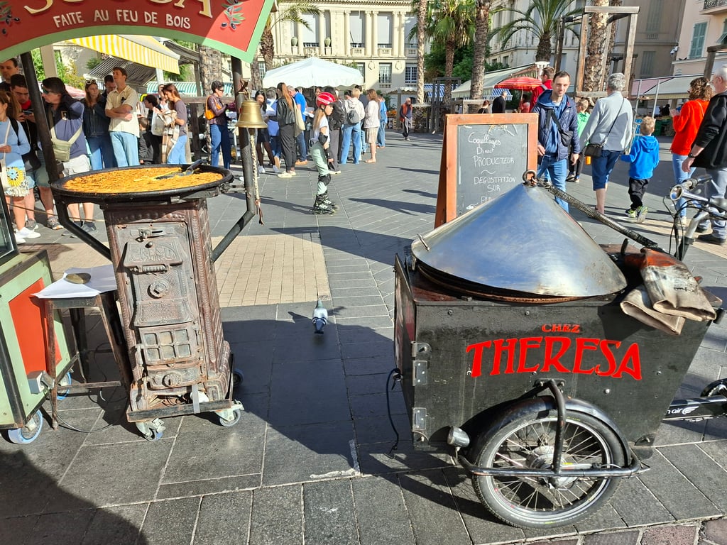 The market sparks my appetite. In a nearby square, a stand sells Socca, a Niçoise speciality: a savoury pancake made of chickpea flour, delivered fresh throughout the day by a man on an adapted bicycle with a front-mounted warming vessel. It is tasty, though my mind insists it looks like a sweet crepe in need of Chantilly cream!
