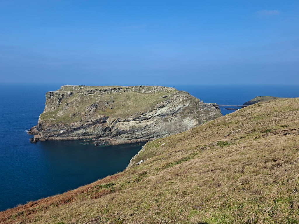 The route continues westward until it reaches the well-kept Southwest Coast Path, my favourite walking route in England. Mist still blurs the horizon, so I cannot see where the ocean ends, and the sky begins. The turquoise water looks more Mediterranean than Atlantic. Ahead of me is the unmistakable sight of Tintagel Island, its layers of black, grey, and white making it look like a prehistoric cake. A handful of herring gulls circle close to shore, specks of white against the clear water. I sit on a bench made of old railway sleepers and savour a rare moment of silence.