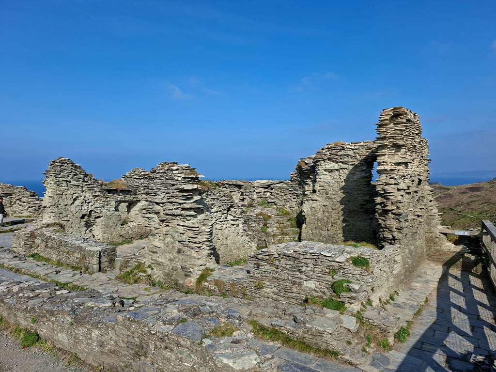 Following the acorn-marked trail, I reach the remains of the thirteenth-century Tintagel castle. Its pointed entrance arch, constructed of local slate, blends seamlessly into the contours of the rock. It feels cool and moist beneath my fingertips. Ahead, a modern pedestrian bridge links the mainland to the main castle ruins, its stark red colour jarring against the natural coastline. Begrudgingly, I walk across the twenty-first-century bridge and back, thankfully, into the thirteenth, entering the main dining hall. The slate walls, though decorated with a thin film of green moss, are still standing against time and weather. I imagine the grand royal banquets that must have taken place here.