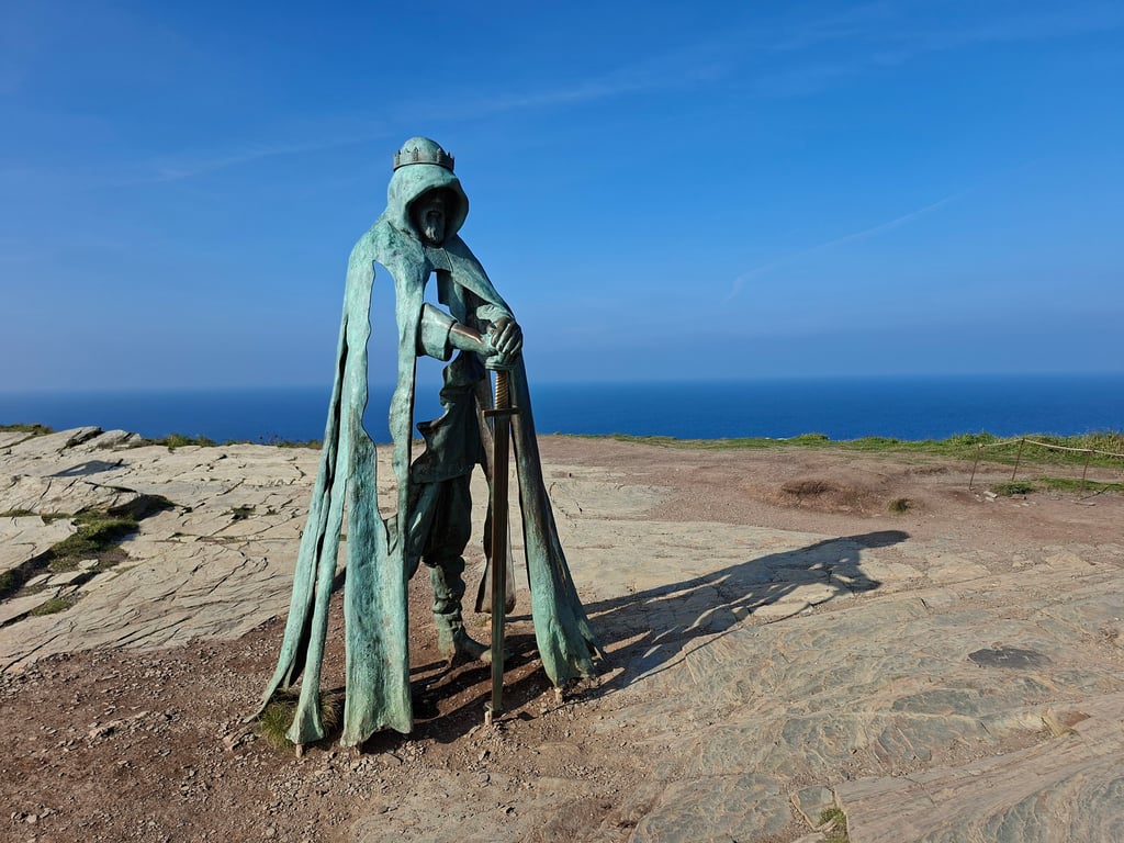 I continue around the island, resting periodically. Jagged granite juts from the cliffs like incisors and the coastline is covered in a carpet of brown ferns that shimmer like rust. I am met by a six-foot statue of King Arthur at the far end of the Island, who legend has it was born here. The bronze figure is partly hollow, as if it were corroded by centuries of westerly gales. I can see his sword-carrying hand has been touched by pilgrims, giving it a golden glow.